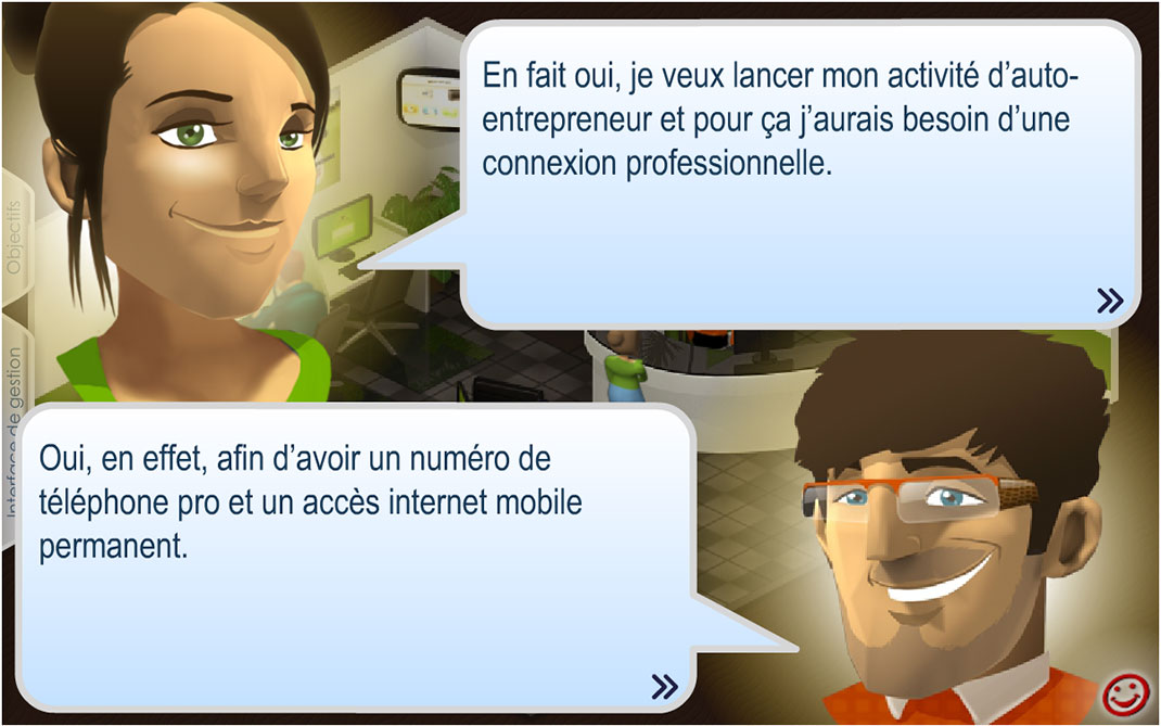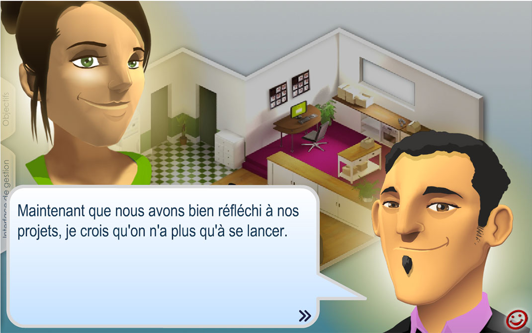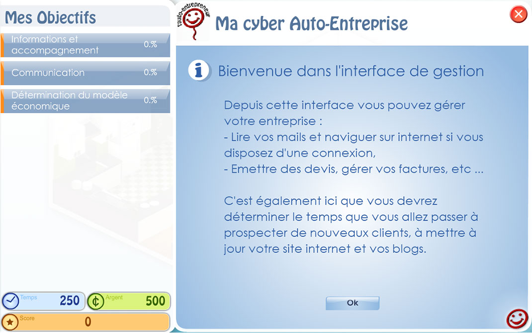 Ce serious game en 3D simule la vie d’un auto-entrepreneur, de la naissance de son entreprise à la vente de ses produits ou services, en passant par leur production et la gestion de l’activité. Il permet au joueur d’appréhender les enjeux et les difficultés liés à chaque étape de la vie de l’entreprise, de bénéficier de conseils personnalisés et d’apprendre les bonnes pratiques pour maximiser ses chances de réussite. Au travers de graphismes riches et réalistes, l’utilisateur est mis en situation pour découvrir et mettre en pratique les démarches nécessaires au succès de son entreprise ainsi que les pièges à éviter.