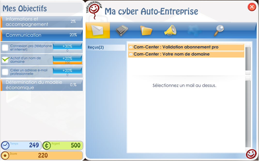 Élu meilleur Serious Game de l’année 2010 lors du Serious Game Expo, ce jeu de rôle ludique et complet offre deux scénarios possibles : la production, la gestion et la vente de produits, via les bijoux-fantaisies d’une part, et de services, via le conseil en informatique d’autre part. Cette distinction permet d’aborder les problématiques spécifiques à ces différents domaines et d’orienter au mieux les auto-entrepreneurs dans la réussite de leur projet.
